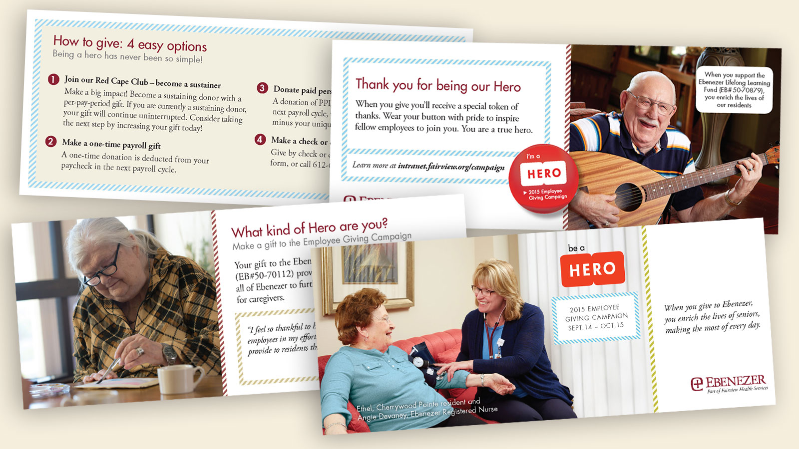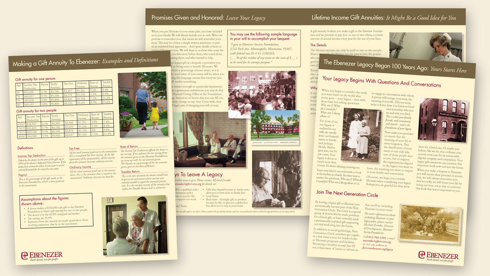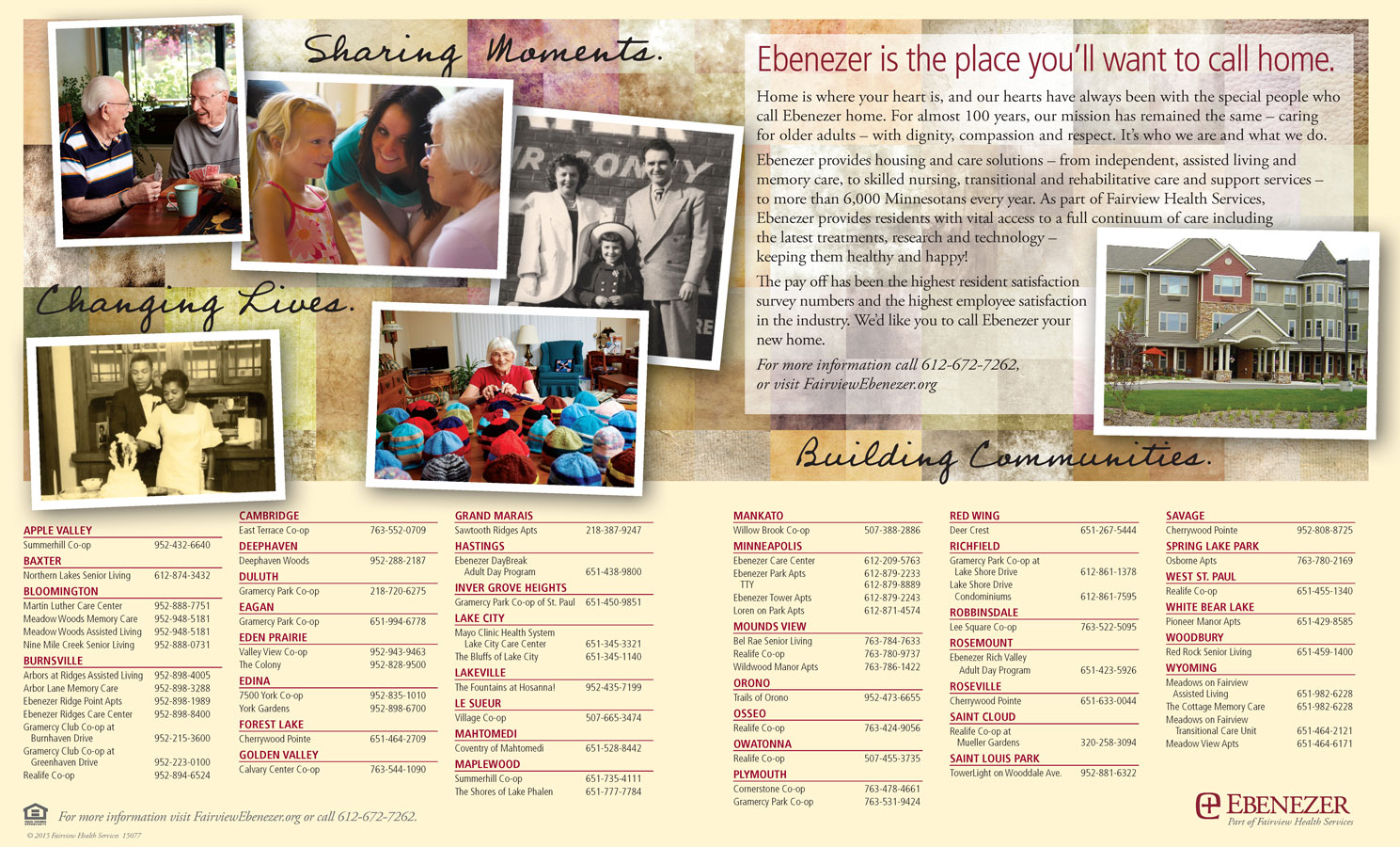 Ebenezer is the senior care division of Fairview Health Services and the largest provider of senior communities in the state of Minnesota, with about 80 locations. I have been a freelance creative resource to Ebenezer for about five years and in that time have worked on a multitude of projects, from event flyers to fundraising case collateral, to presentation materials and marketing emails.