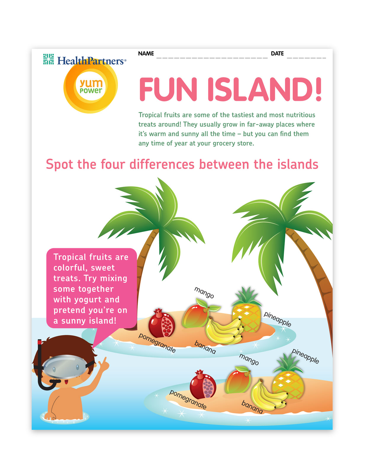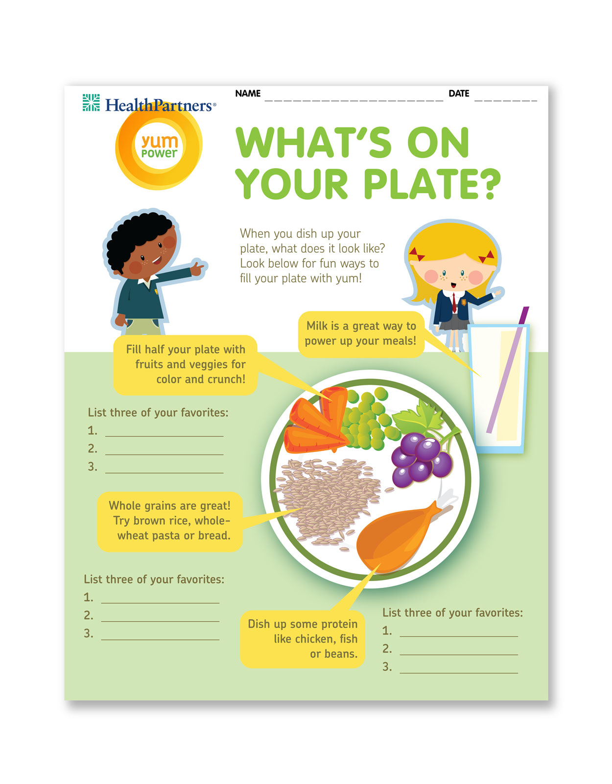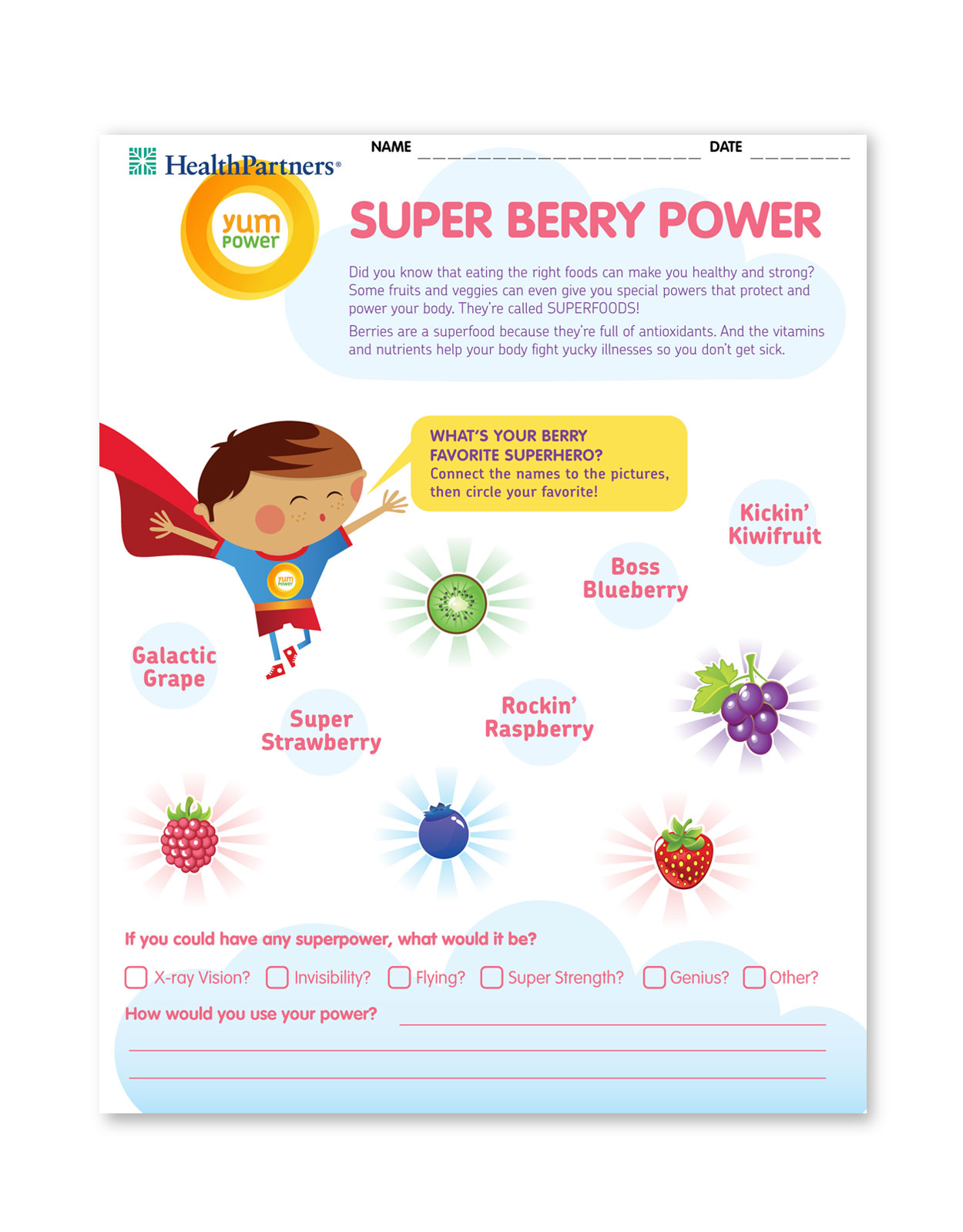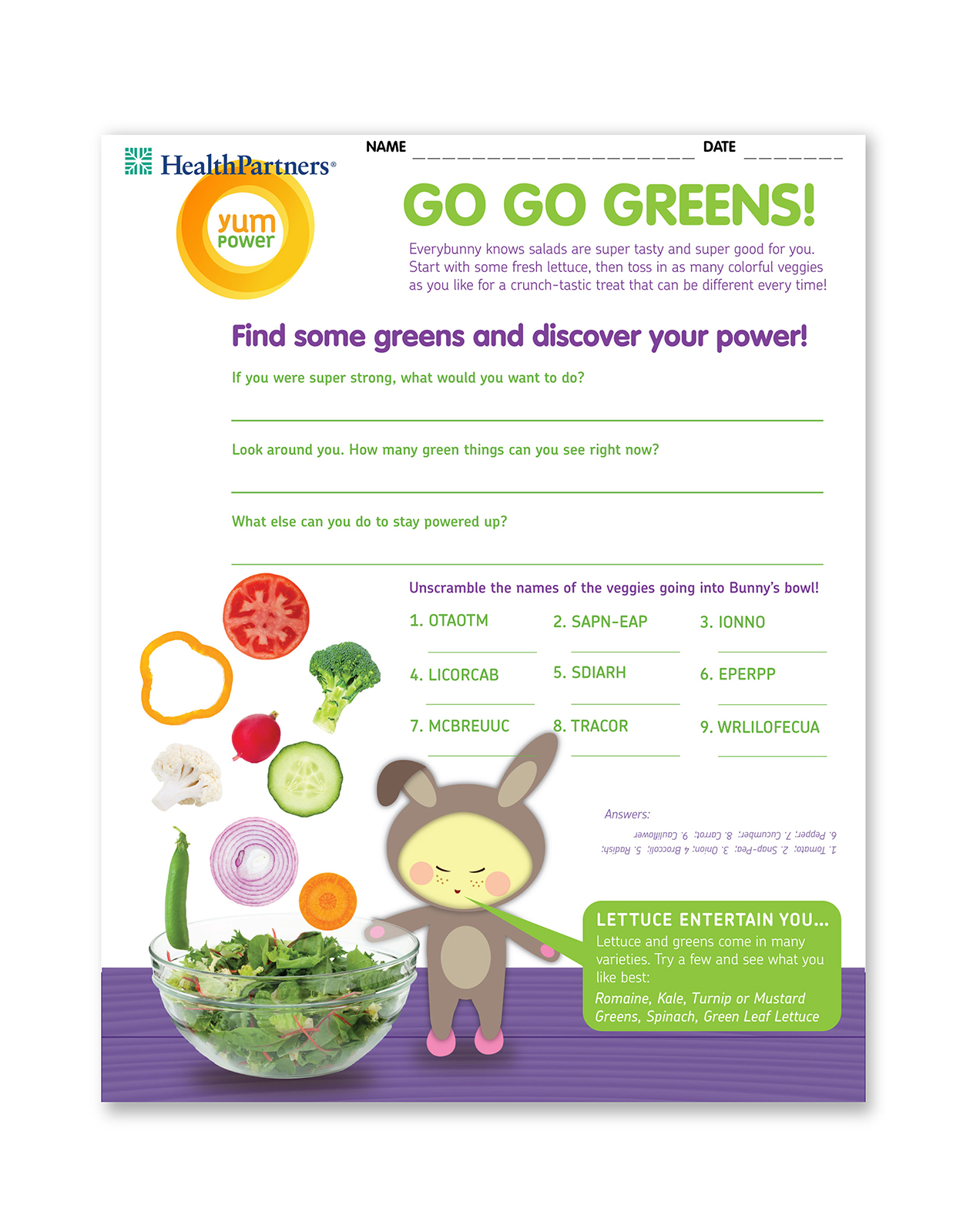 HealthPartners, a large non-profit health care organization headquartered in the Twin Cities, has undertaken a far reaching integrated marketing/public service campaign titled “yumPower,” urging people to eat well. I was engaged to create the visuals for a series of student activity sheets highlighting healthy eating information. The challenge of this assignment was to match the yumPower look and feel that had been created by a large advertising agency and included custom illustrated characters. I manipulated disparate stock illustrations to match one and other, the subject matter, and the original campaign. This worked to excellent effect, and at a far lower cost than custom illustration.