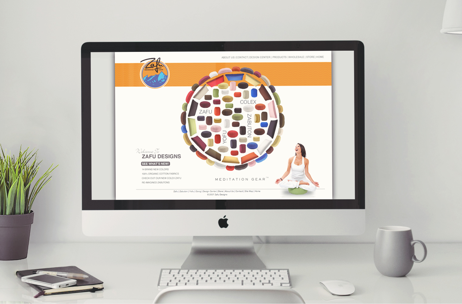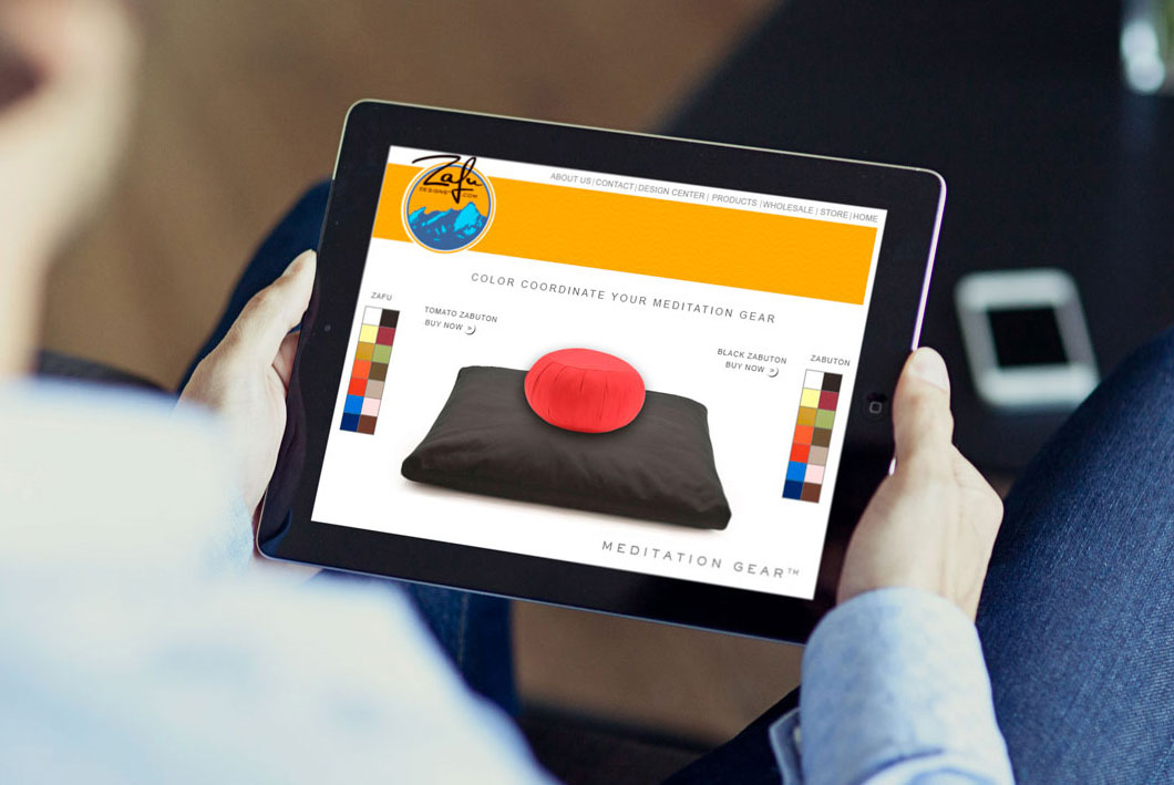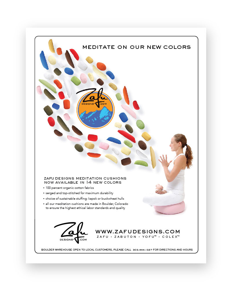 Zafu Designs of Boulder, Colorado manufactured cushions and pillows for the meditation and yoga niche markets. The founder of the company set out to change the world by promoting ‘the mindful lifestyle.’ I was engaged to create a branded experience for online customers and drive traffic to the site. After designing a logo and strategizing a brand feel, I strategized the UX and UI of the site and worked with developers and photographers to execute it, including creating a custom interactive design tool. Sub-brands were launched to bring durable natural/hypoallergenic soft goods to new markets, including sleeping pillows and dog beds. I created hang tags, signage, advertising, packaging, pretty much the full gamut of creative services. And I produced all of it. Unfortunately, Zafu Designs shut down after four mostly profitable years, due in large part to the weak economy.